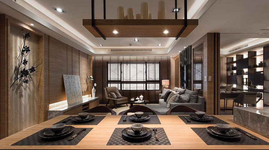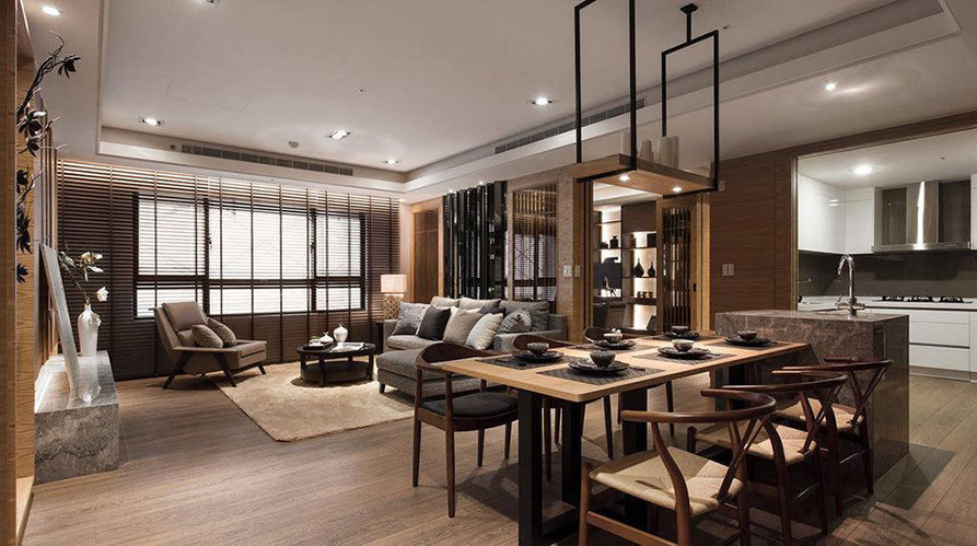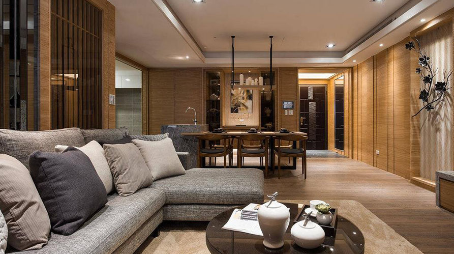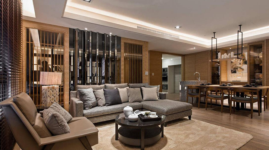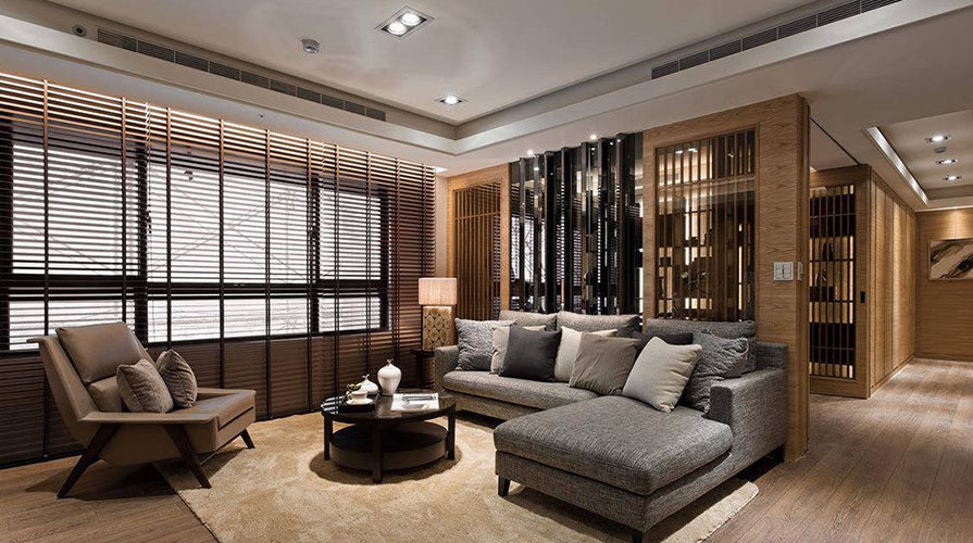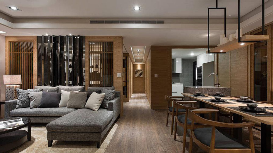 • 空間承載幸福因子,將安居的和諧之美,結合空間衍生的悸動,編織成美好的記憶。本案中,設計師為年輕夫婦打造通體連結、又能相互獨立的空間。來到內部,可清楚地感受質樸的人文質感,設計師用簡約的線條,搭配溫潤的材質,營造出空間美學的平衡感。 玄關延伸至客廳處,以切割線條及鋼刷山形木紋呈現塑造空間靜謐沉穩的意象。充滿雅韻的書房,窗邊配置了臥榻與茶幾,可變為客房使用;墻面書架則以開放層板表現人文意涵。另一個亮點是書房與客廳的隔斷,中段處采用斜向式的灰鏡表現穿透感,締造出高品味的質韻。