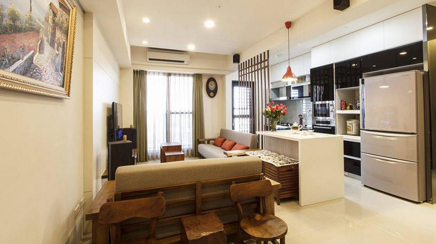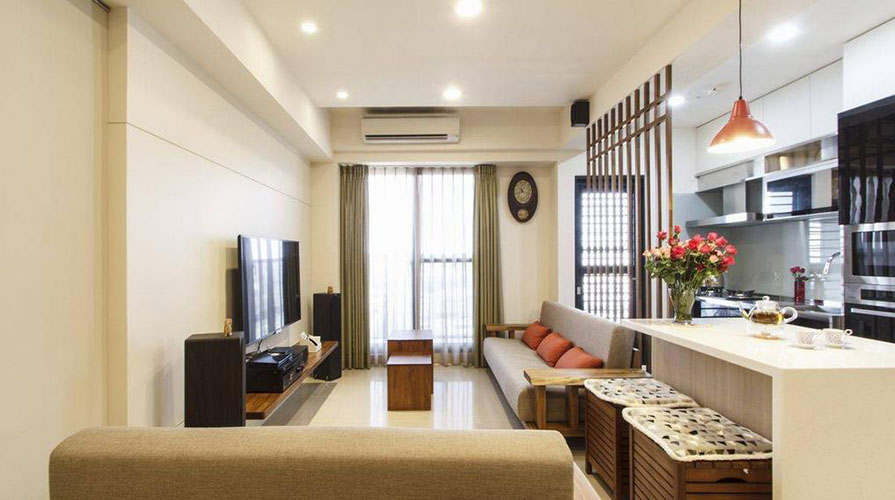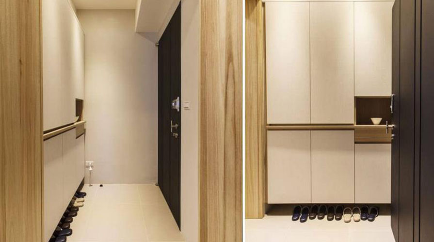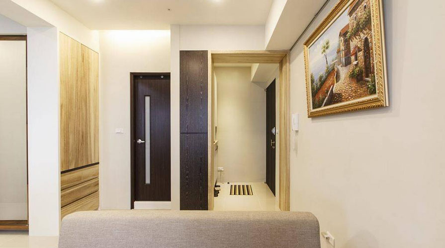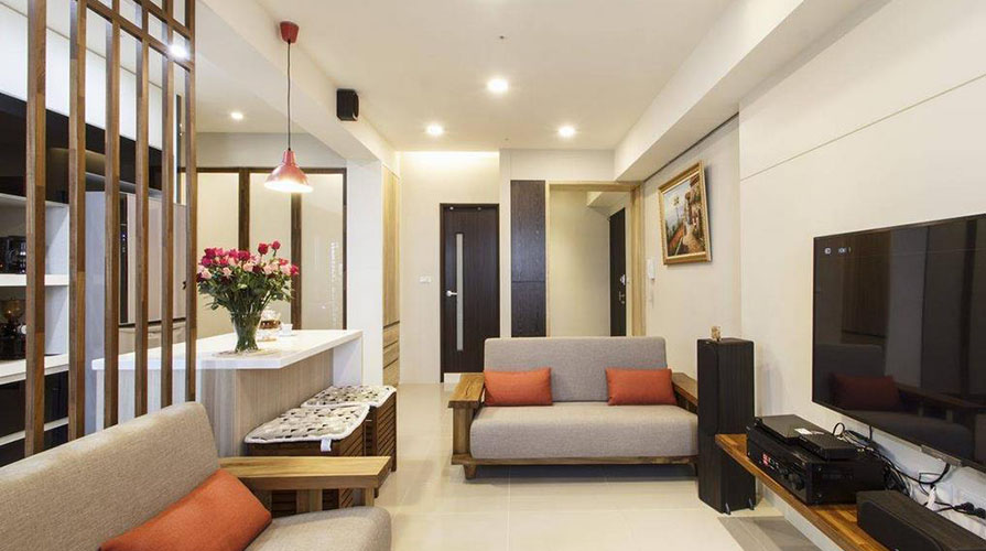 • 已屆退休年齡的夫婦,考慮到未來的兩人生活,搬入這家電梯大樓型式的生活空間。居室的功能規劃以實用為主,大量運用屋主喜愛的木質元素,利用不同的木質顏色變化,巧妙將屋主事先選購的天然柚木家具融入其中,銜接帶著自然觸覺的柚木紋理。設計師在考慮屋主的生活習慣后,保留客廳在前、廚房在后的相對位置,以木格柵為界,將餐廳機能簡化于客廳與廚房之間,厚實的柚木家具,圍塑出明確的客廳空間。而原先餐廳的位置,成套的柚木對談椅置于柚木沙發后方,成為入門后的風景。